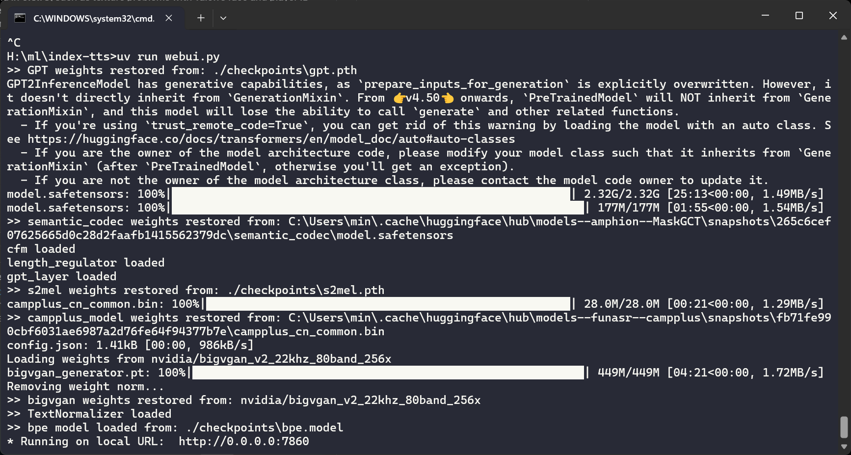 使用 uv run webui.py 命令运行,在此期间必定需要从 huggingface 下载模型。注意访问速度或者使用 HF_ENDPOINT 分流(看官方文档)。