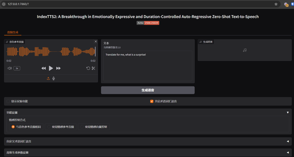 这里不需要关注此模型的技术细节,初步的介绍与部署方式直接看官方的 README-zh 即可。以及官方的演示页面 IndexTTS2(Github) ,里面有非常只管的演示