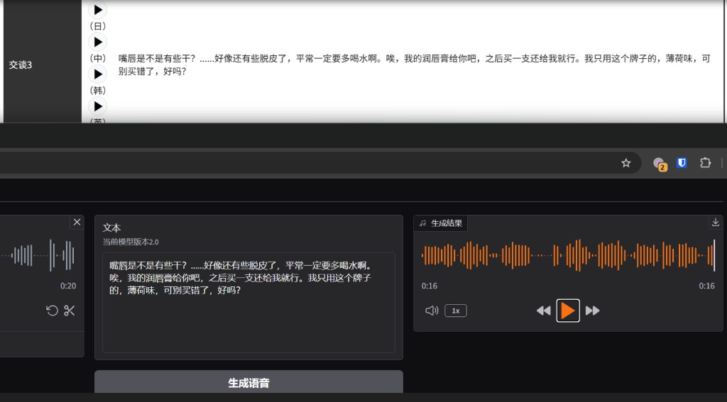 然后关键的来了,我将游戏中语音作为音源,拿另外一段语音的文字合成,然后将合成的音频与官方语音进行对比。最终效果虽然还是有那么一些“痕迹”,不过已经完全超出了我的预期。终于能够分场景,多人物,有感情的朗读课文了(泪目)。