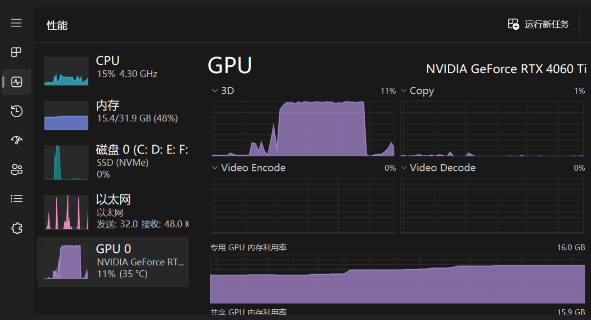 资源占用方面,现在使用这个入门级的 4060 Ti 勉强还可以用用, 8 G 显存感觉应该很吃力,不要浪费时间了。